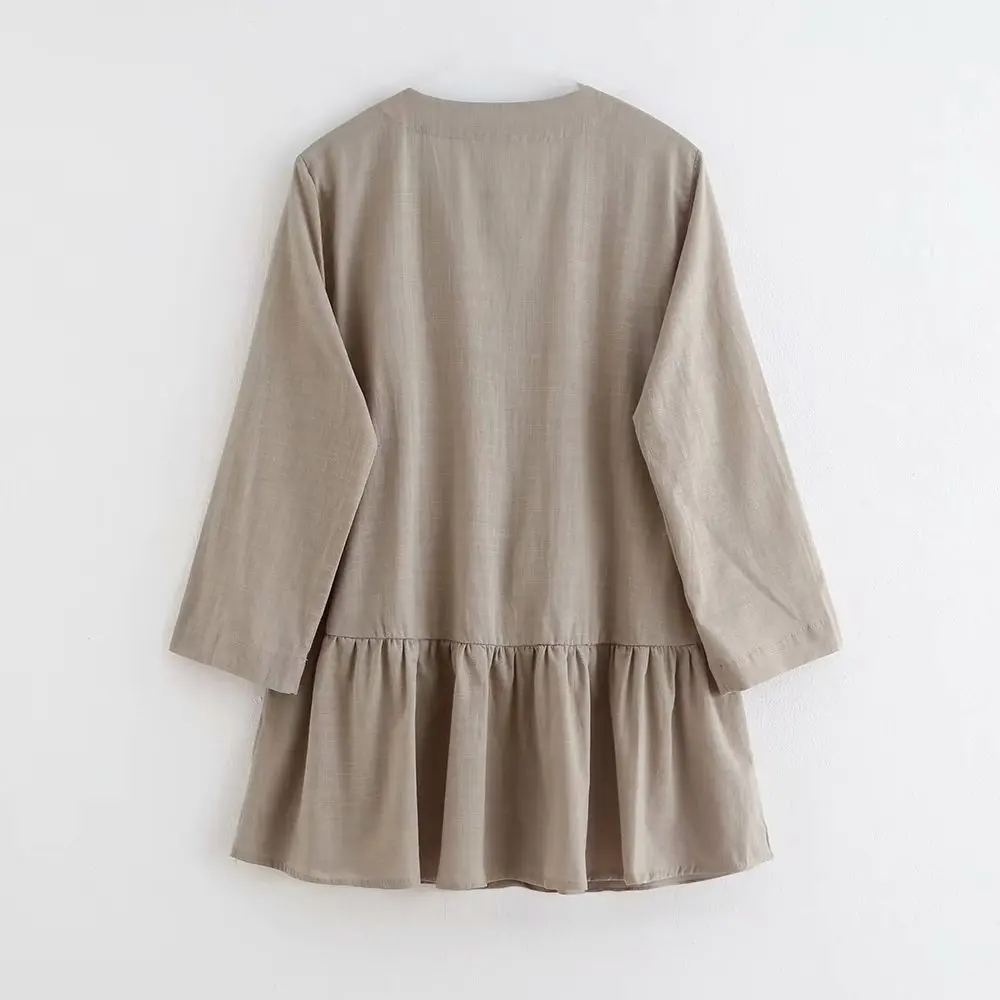 Finest women vintage V neck buttons pleats casual smock Shirts blouses office lady nine sleeve linen roupa
