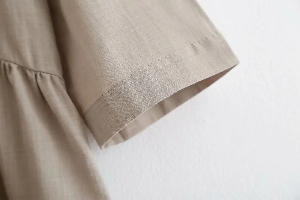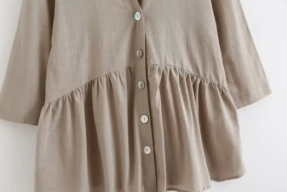 astounding women vintage V neck buttons pleats casual smock Shirts blouses office lady nine sleeve linen roupa