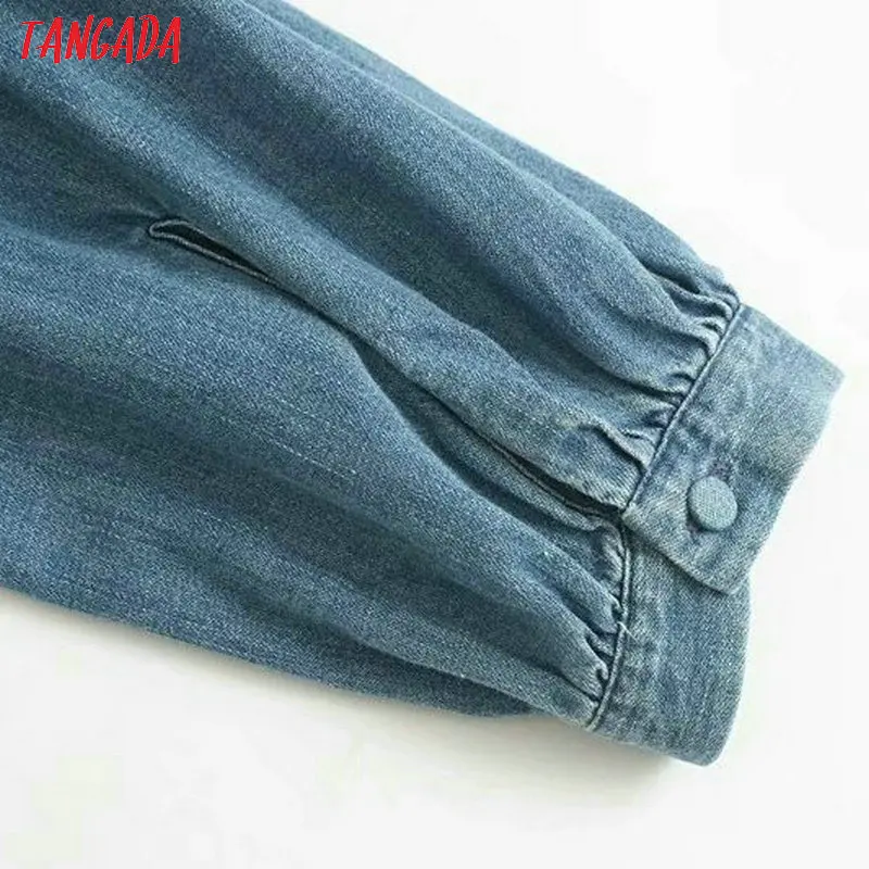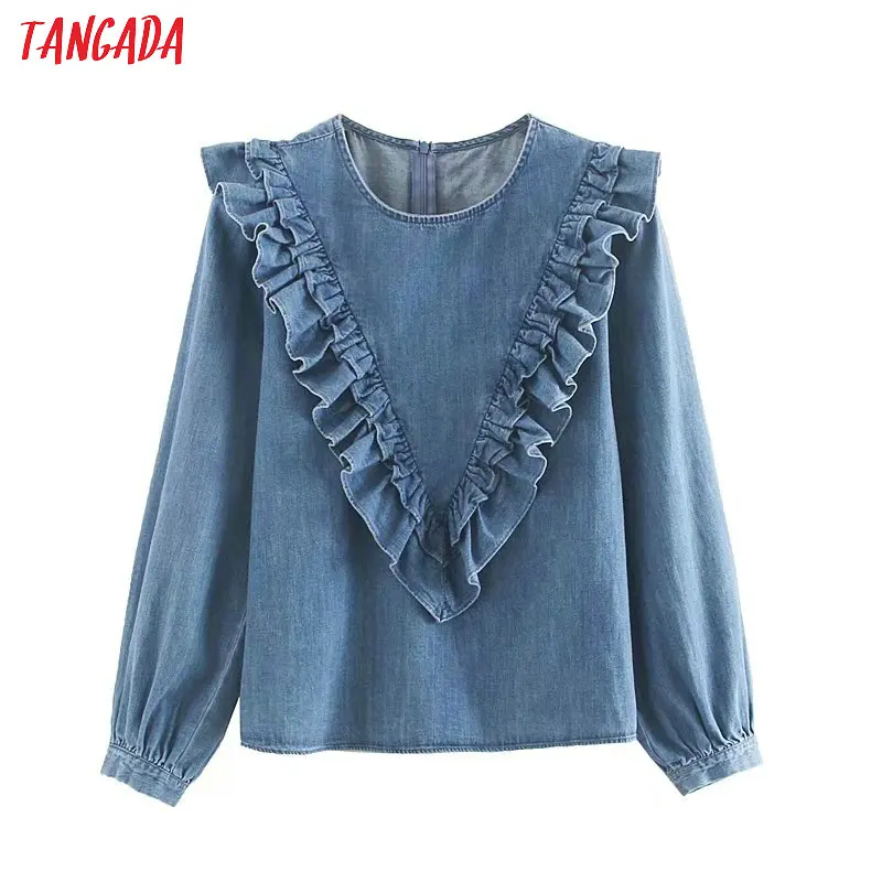 awesome Tangada women vintage denim blouse 2019 autumn o neck ruffled long sleeve shirts female chic tops 4