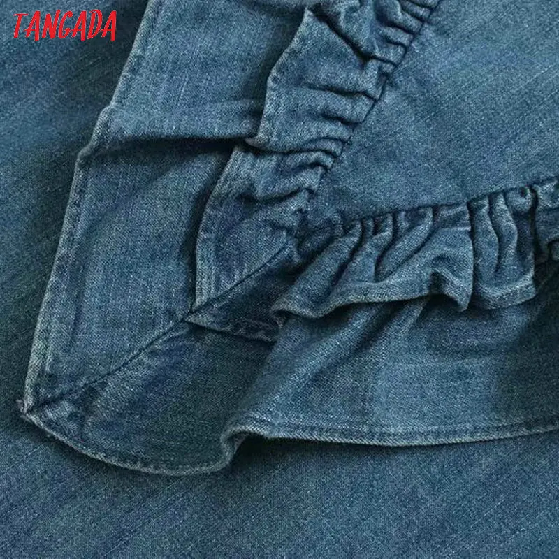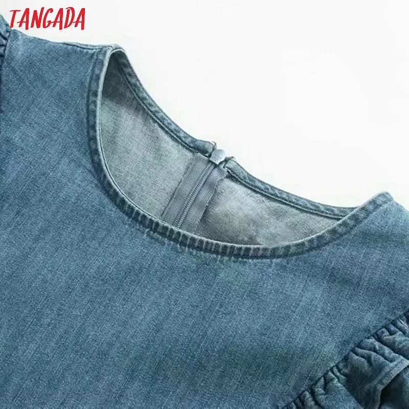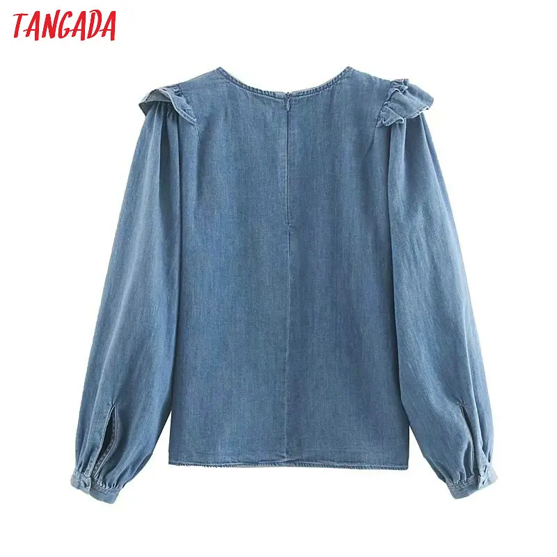 buy Tangada women vintage denim blouse 2019 autumn o neck ruffled long sleeve shirts female chic tops 4