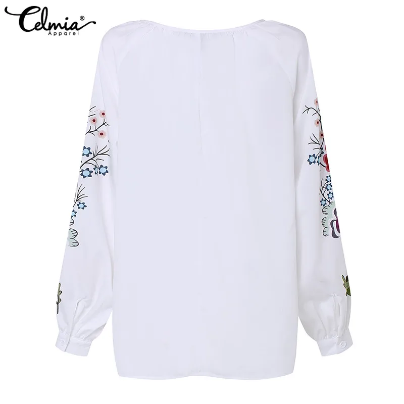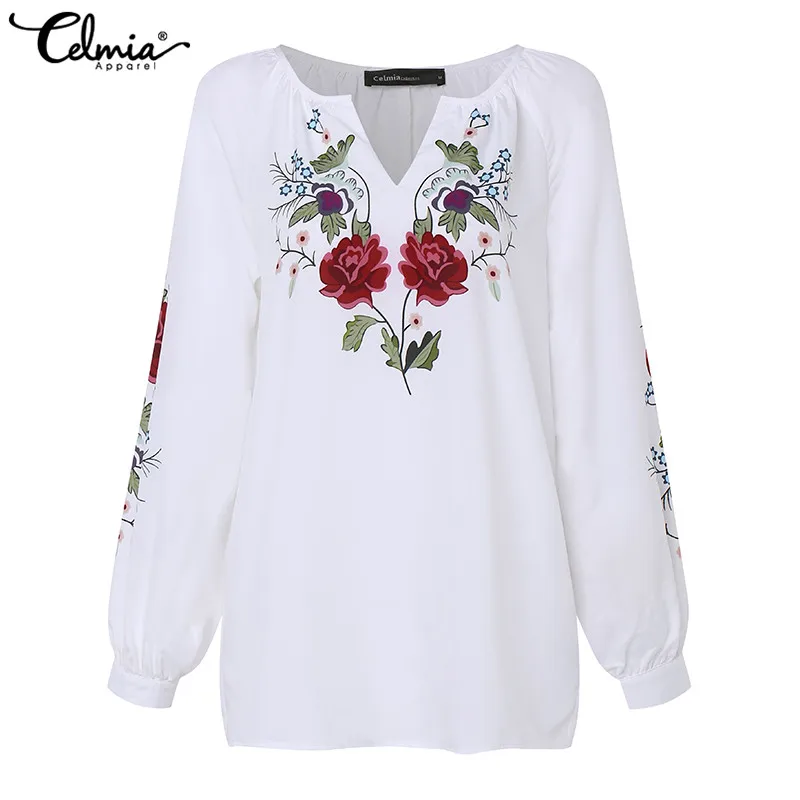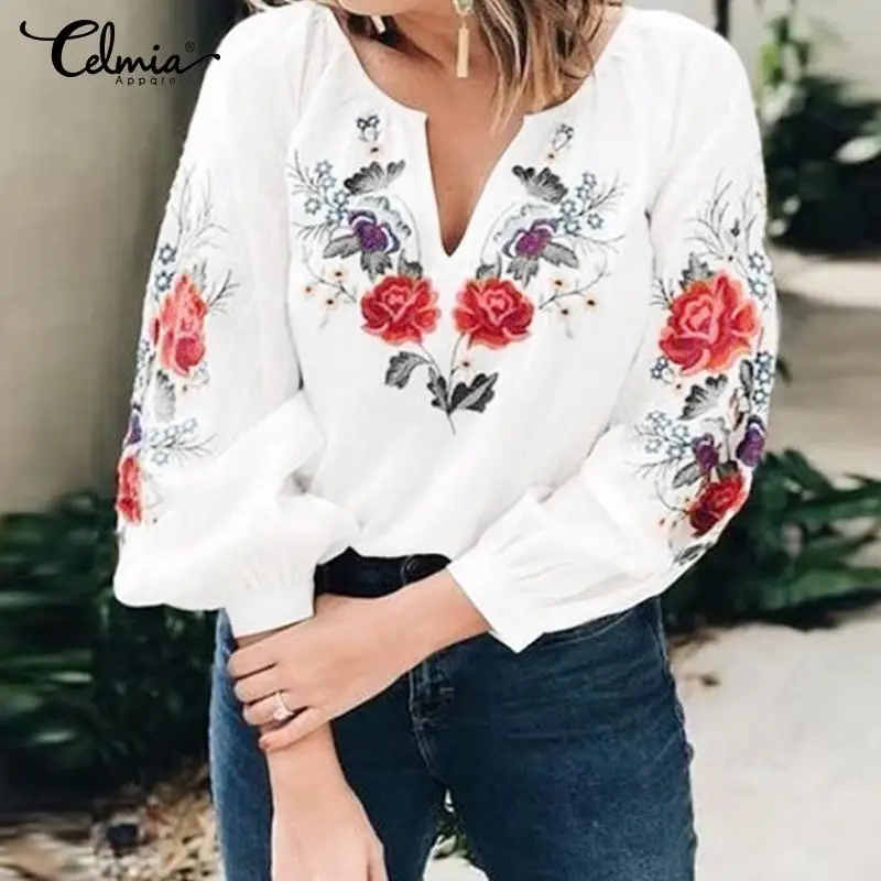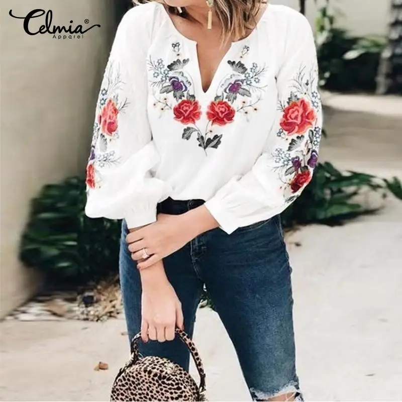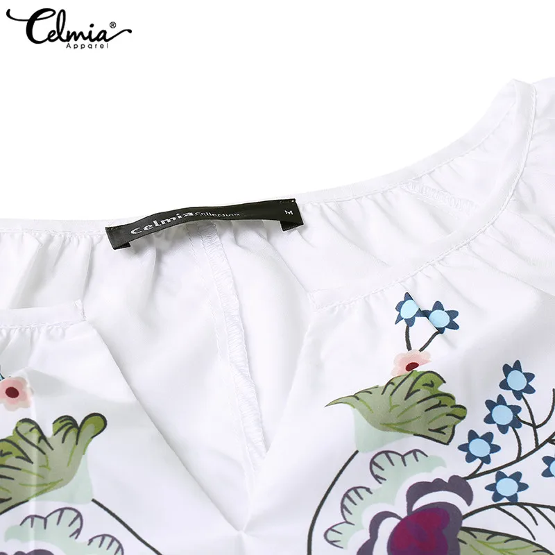 discount Celmia Women's Vintage Blouses Plus Size Tops Sexy V Neck Puff Sleeve Casual Shirts Loose Floral Pr
