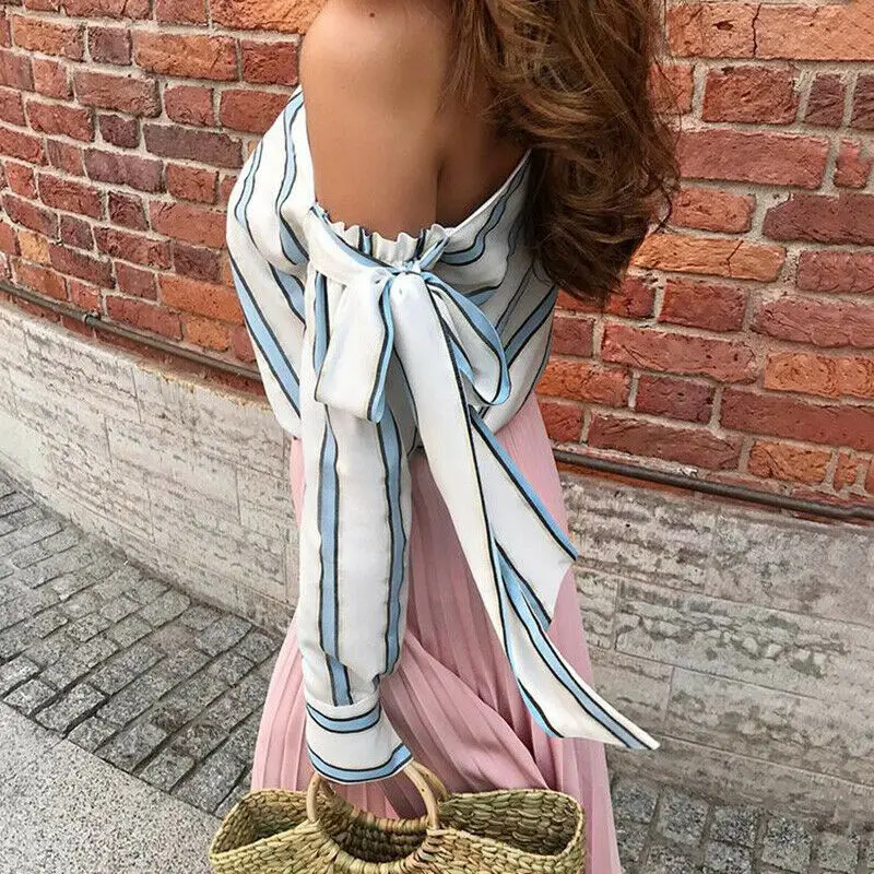 Finest New Womens Elegant Shirt Blouses Striped One Side Bow Tie Off Shoulder Shirts Office Lady Long Slee