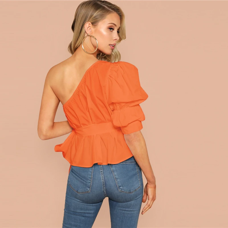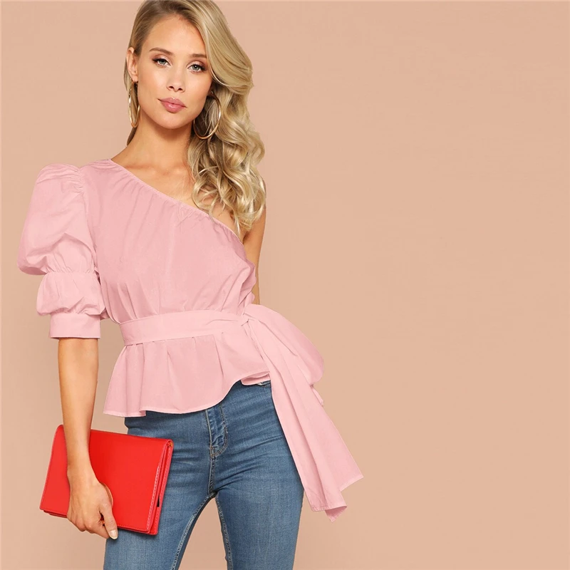 Very best SHEIN Sexy One Shoulder Puff Sleeve Peplum Knot Belted Top Blouse Women Summer 2019 Solid Ruffle El