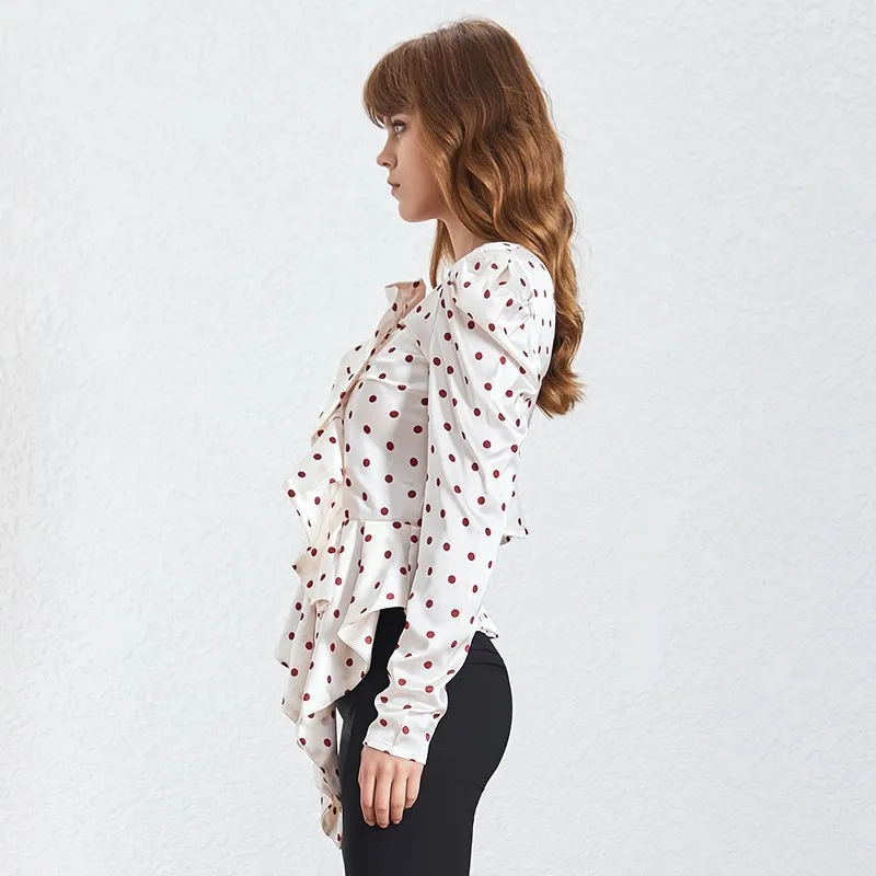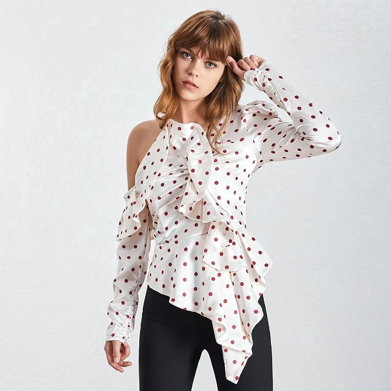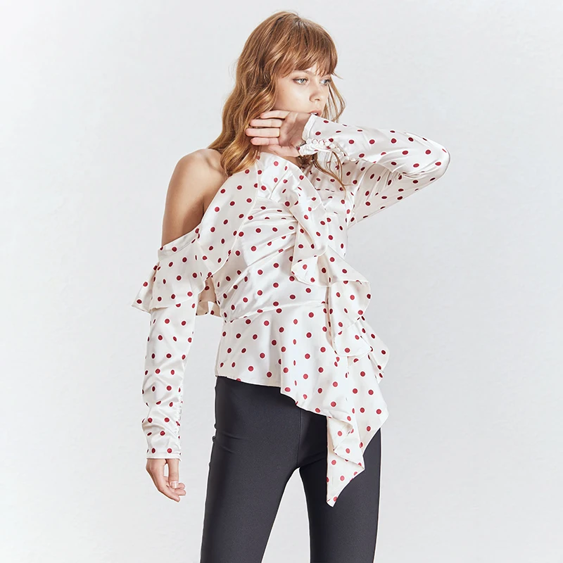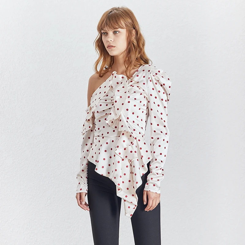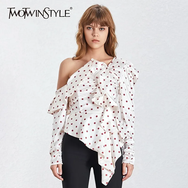 Ideal TWOTWINSTYLE Elegant Polka Dot Women Blouse Off Shoulder Puff Sleeve Irregular Ruffles Slim Shirt F