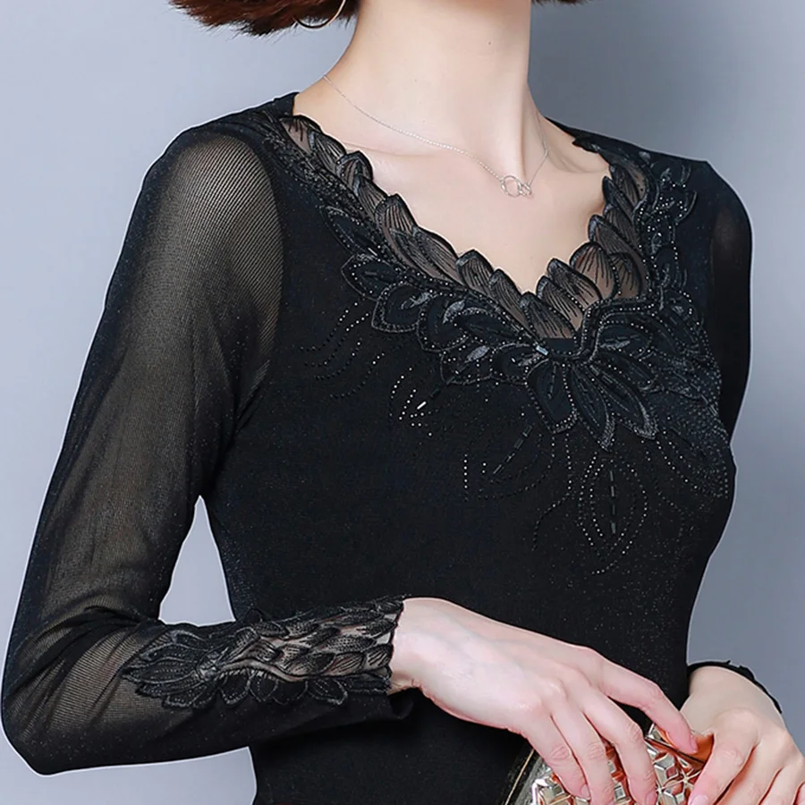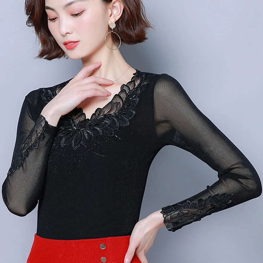 incredible Lace blouse bottoming fashion shirt slim 2019 new autumn women long sleeve Diamonds mesh blouse shi