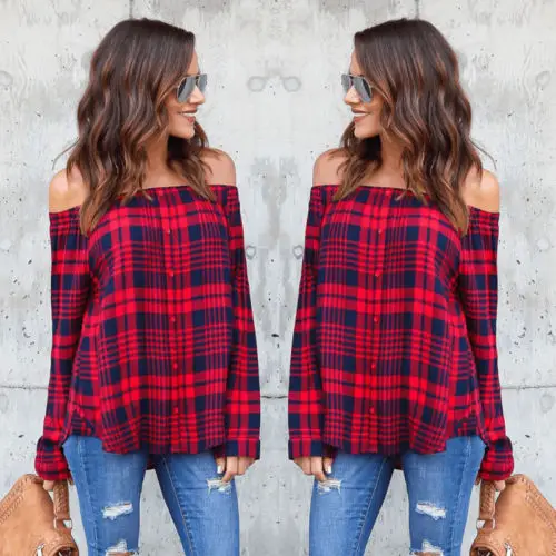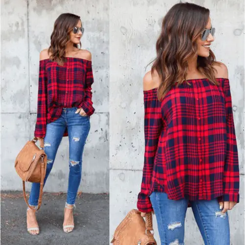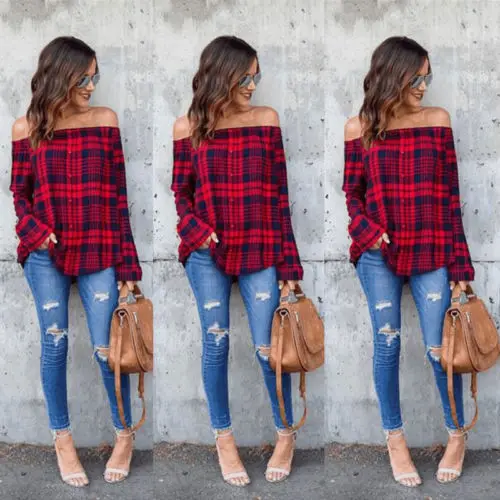 incredible Women Off Shoulder Red Black Plaid Tops Long Sleeve Shirt Casual Blouse Loose Fashion Spring Fall C