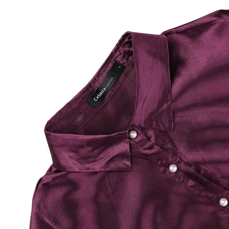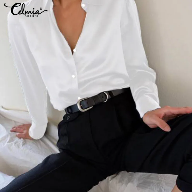 Promo Fashion Satin Blouse Celmia Women Elegant Shirts Stylish Tops Lapel Neck Long Sleeve Casual Buttons
