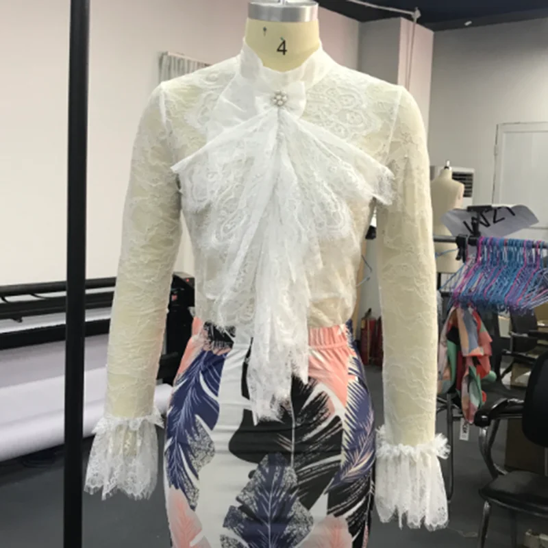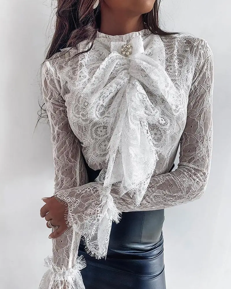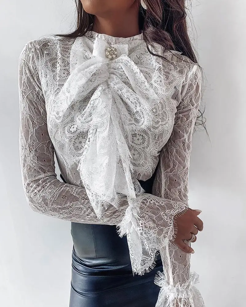 wonderful Women Sexy Lace Blouse Shirts White Beaded Bow Tie Bell Cuff Lace Blouse Tops