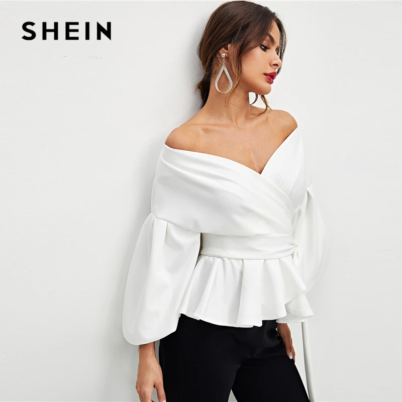 Greatest SHEIN White Office Lady Elegant Lantern Sleeve Surplice Peplum Off the Shoulder Solid Blouse Autumn