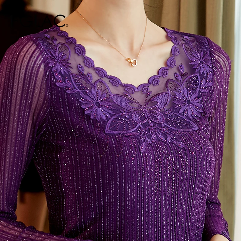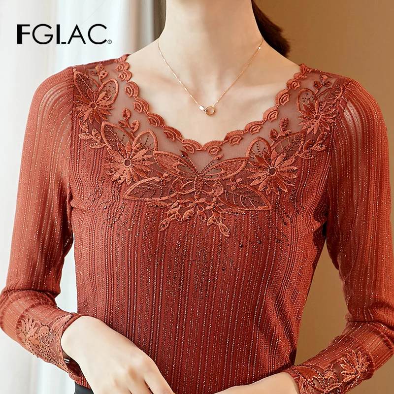buy Women blouse shirt Fashion Long sleeve Autumn tops Elegant Slim Embroidered Lace shirt plus size wo