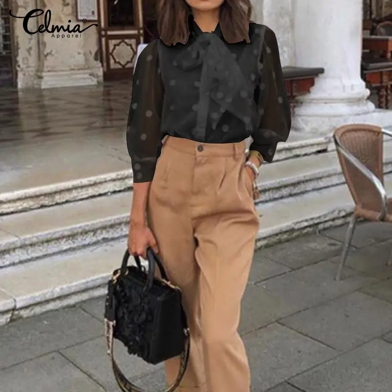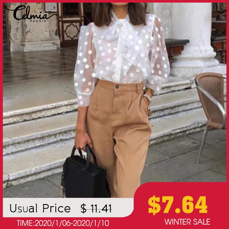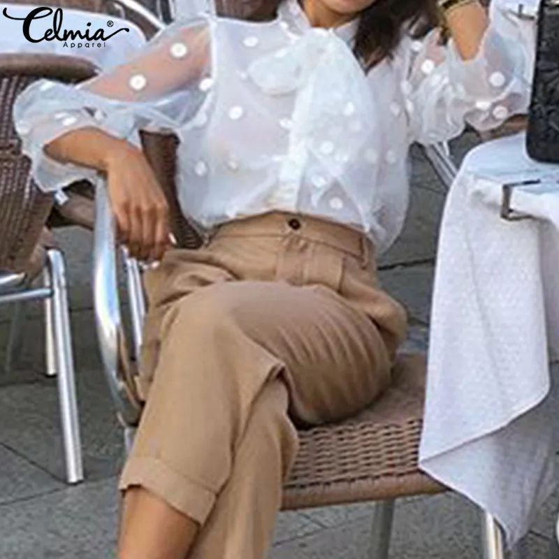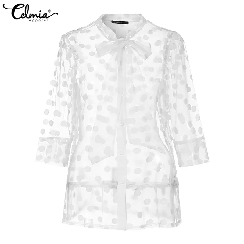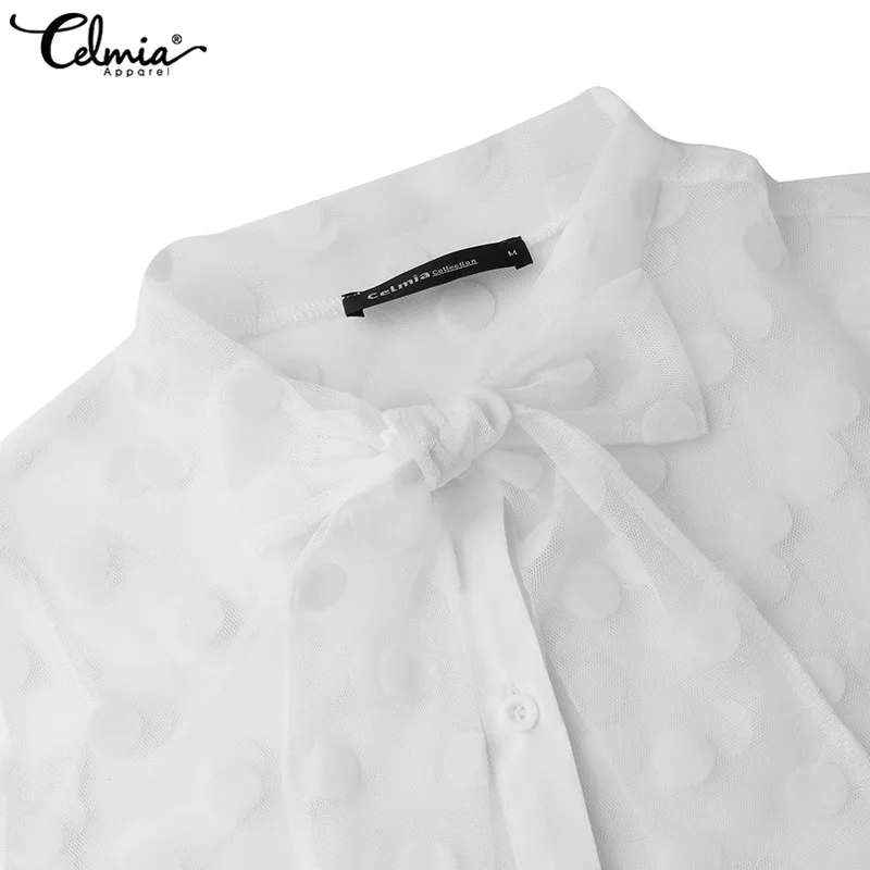 Very best 2019 Celmia S-5XL Women Fashion Polka Dot Blouses Buttons Sexy Mesh Sheer See-through Shirts Gauze