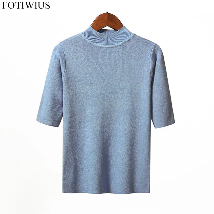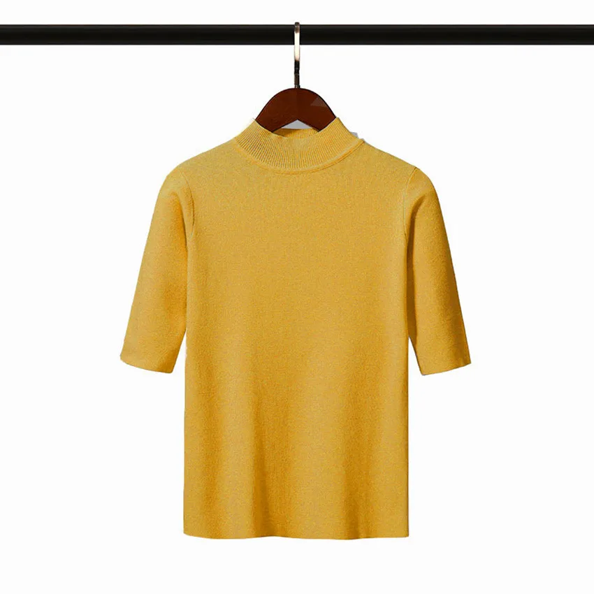low cost 2020 Spring Summer Knitted Top Tees Women High Neck Short Sleeve Fitness Slim Tee Shirt Femme Ladie