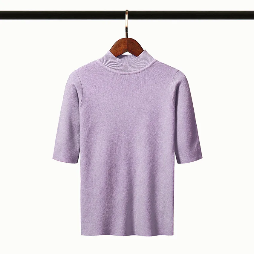 discount 2020 Spring Summer Knitted Top Tees Women High Neck Short Sleeve Fitness Slim Tee Shirt Femme Ladie