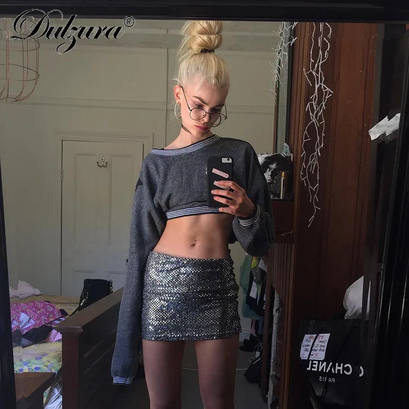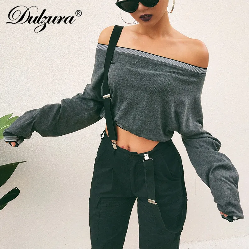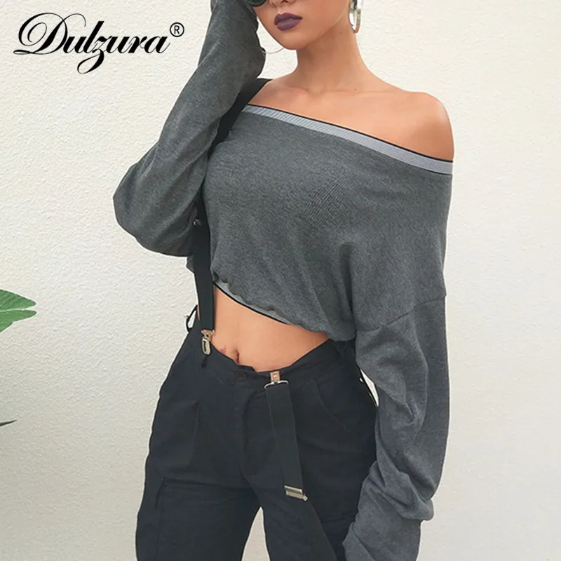 discount Dulzura long sleeve crop top 2018 autumn winter women casual tshirt stretch neck collar patchwork t