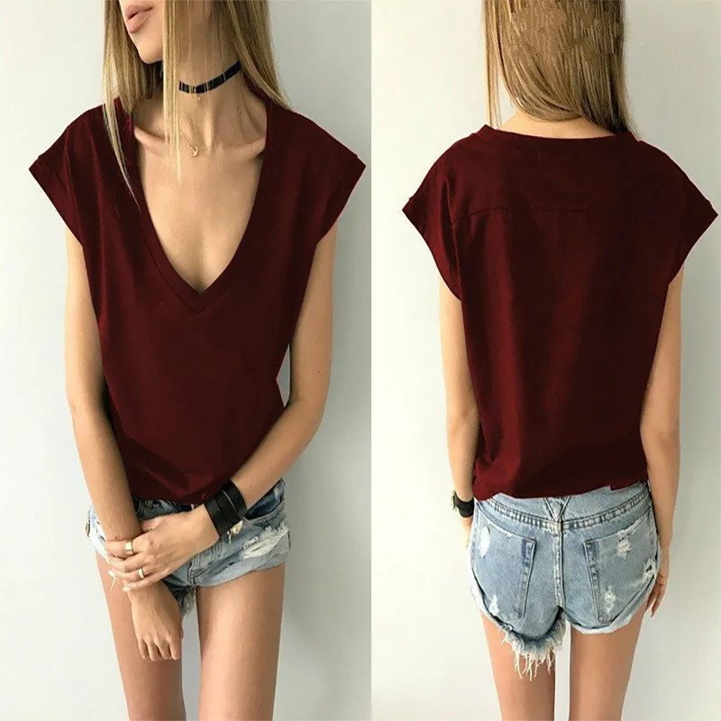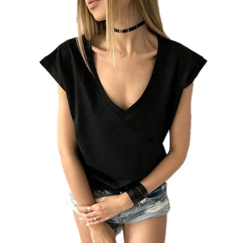 incredible 2019 Summer Short Solid Cotton T Shirt Casual Deep V Neck Short Sleeve Sexy T-shirt Basic Black Whi