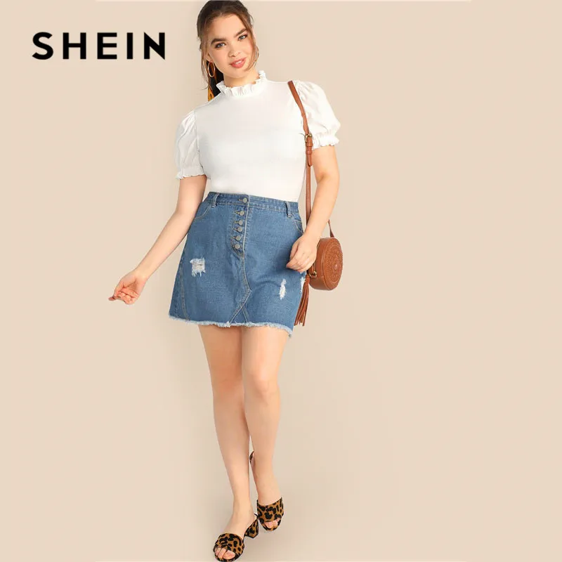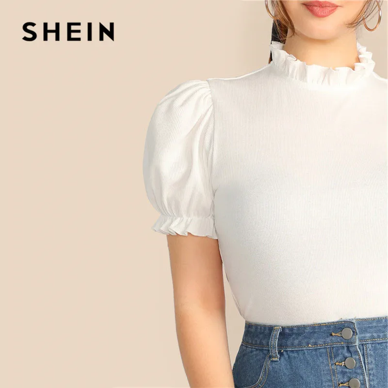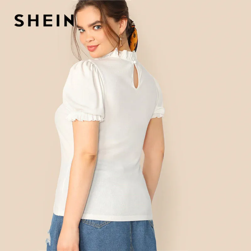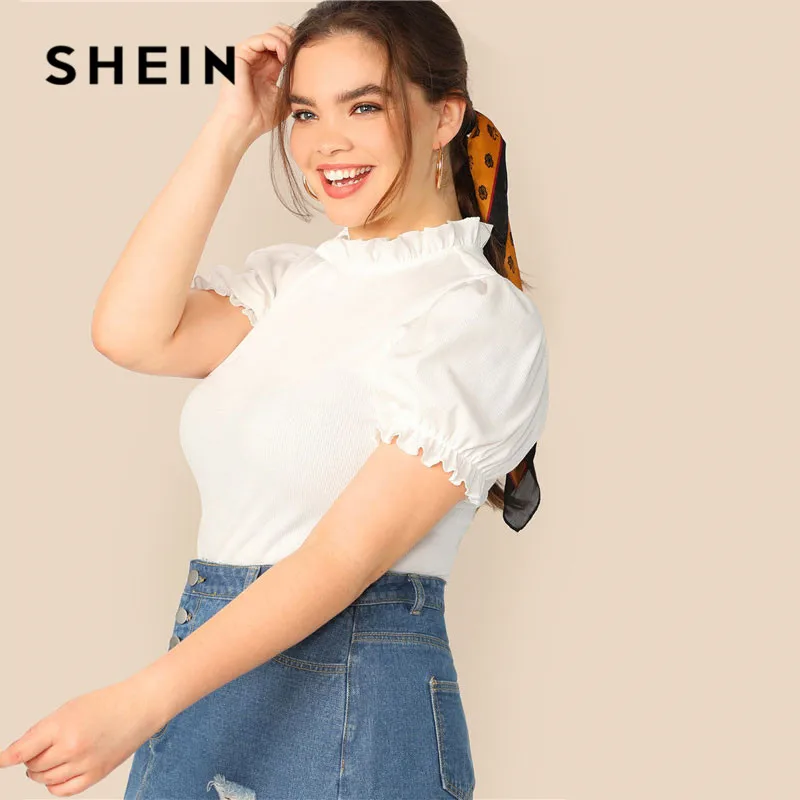 Very best SHEIN Plus Size Lady Frilled Trim Neck Puff Sleeve Rib-Knit Beige T-Shirt Summer Elegant Short Slee